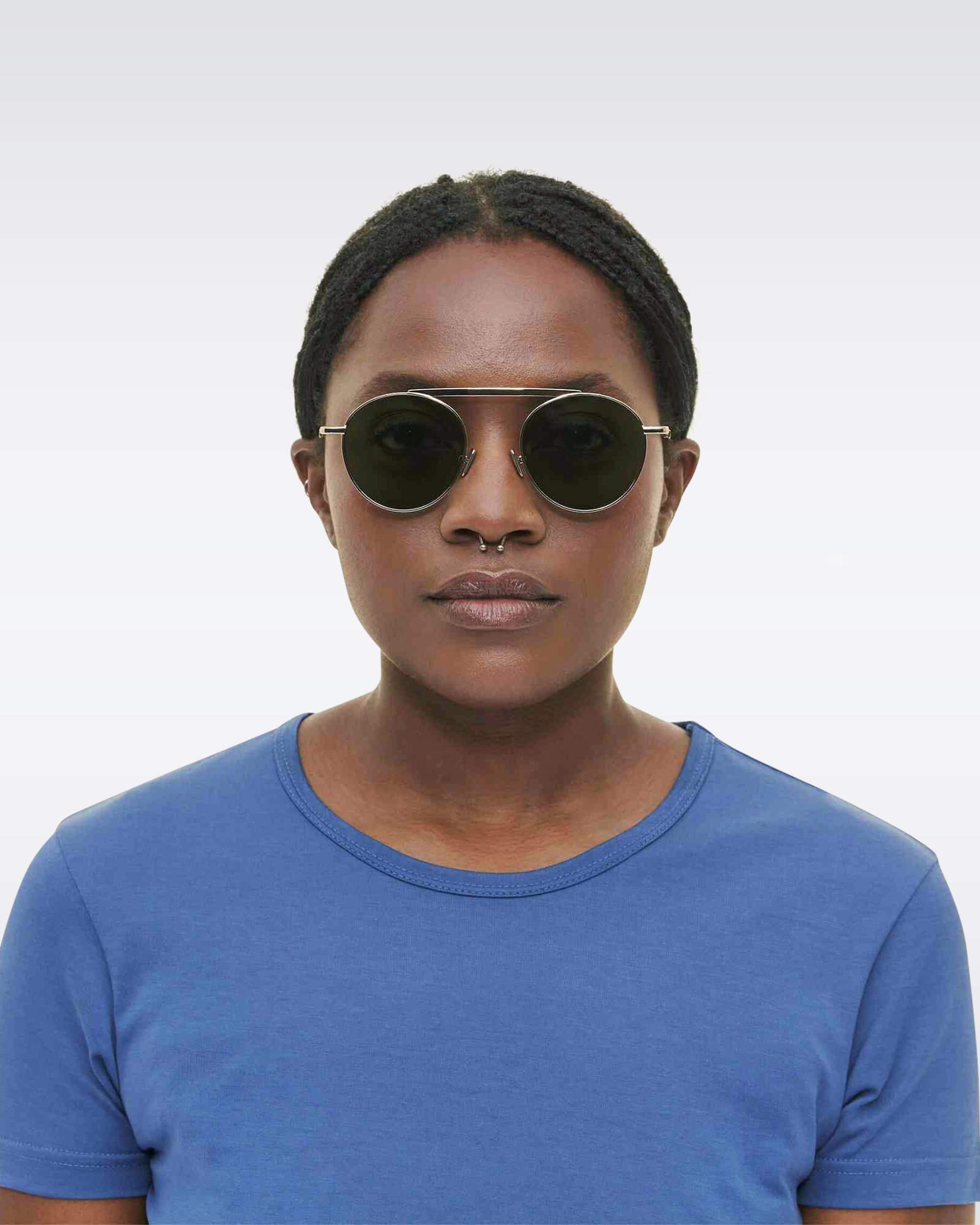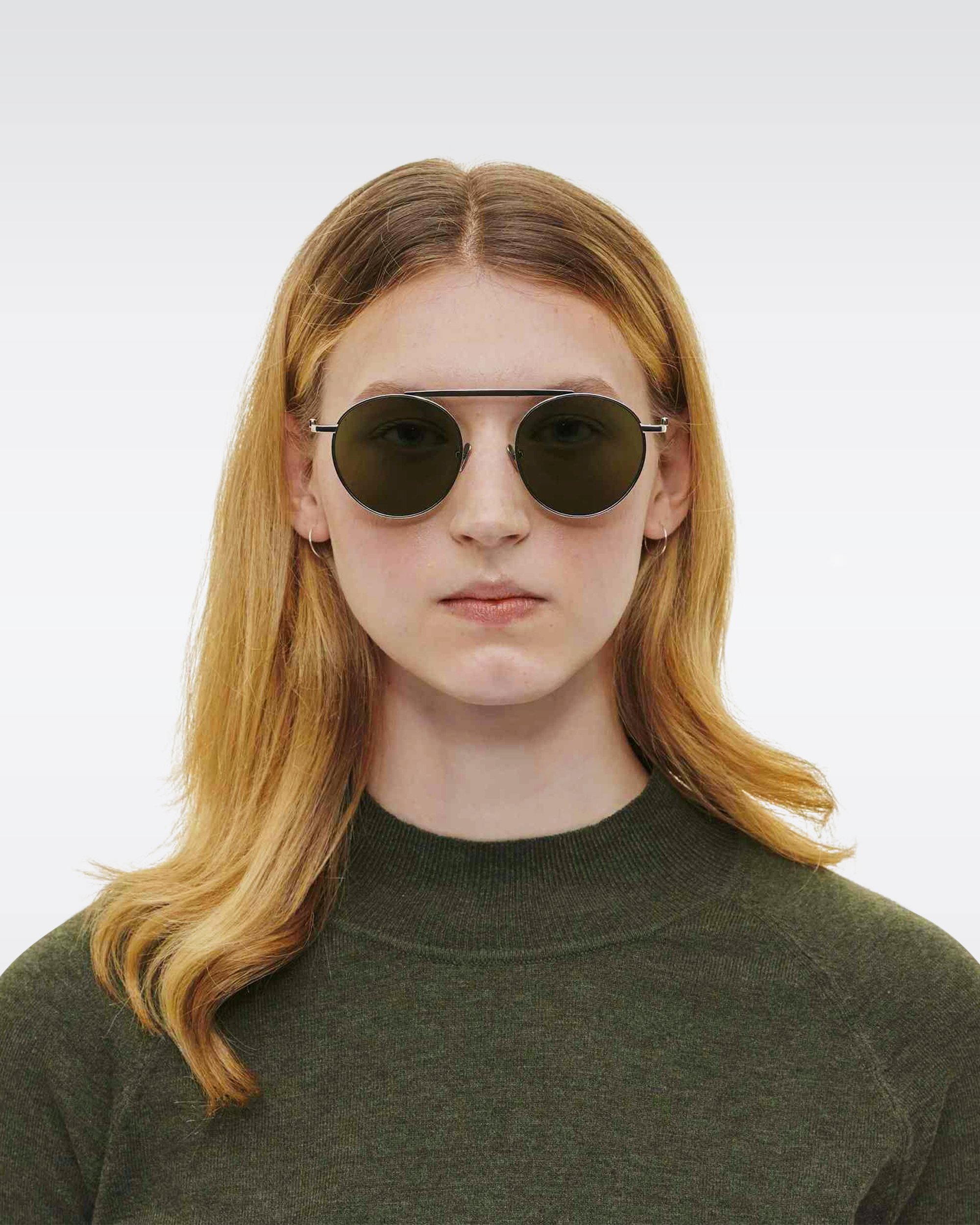 A folding metal frame with a filigree rim. The rounded lens shape is perfect for offsetting angular face shapes, while the metal nose pads provide added support to those with a flatter nose bridge.